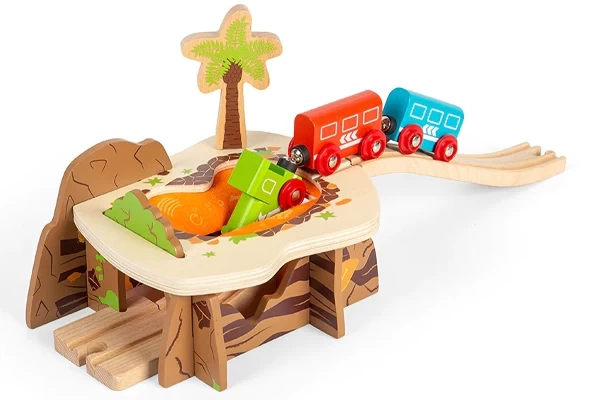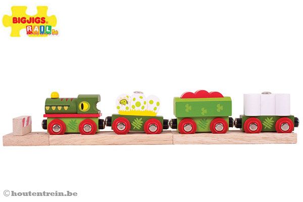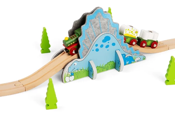 Ga op trein-avontuur in het land van de dinosaurussen! Deze houten treinset bevat 90 onderdelen. Naast railstukken om een treinbaan te maken, biedt deze set allerlei leuke accessoires. Rijd met de meegeleverde treinen door de grot, over de brug en van de dinosaurus-helling af. Tussen de rails kunt u de plekken inrichten met hekjes, dinosaurussen, poppetjes, boompjes en verkeersbordjes. Voor kinderen vanaf 3 jaar.