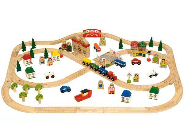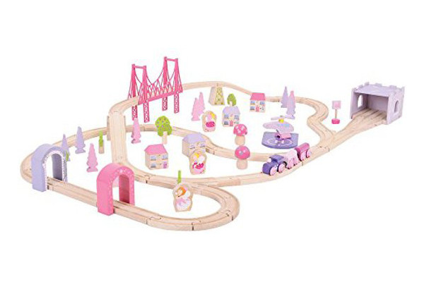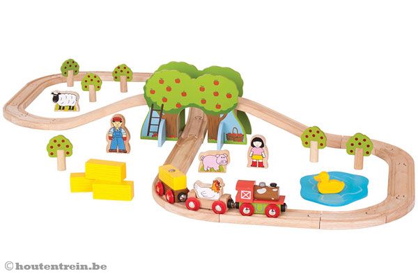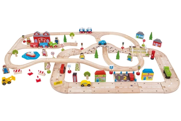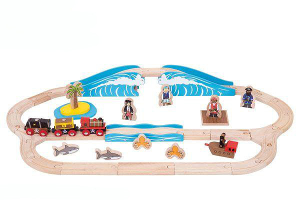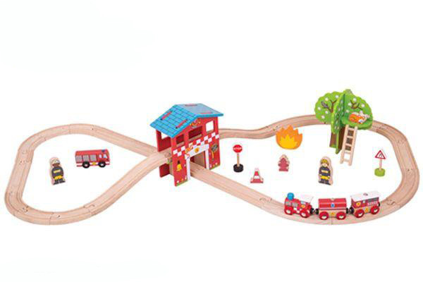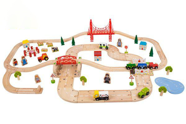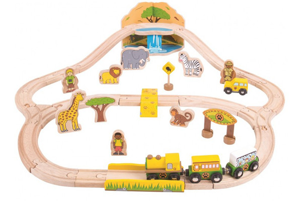 Treinset van Bigjigs voor de echte dinosaurus fans. Speel met de dinosaurussen en de trein met wagons. Durft u met de trein de gevaarlijke vulkaan brug te passeren? 49 delige set bestaande uit o.a. baandelen, trein met 2 wagons, vulkaan burg en 9 dinosaurussen.