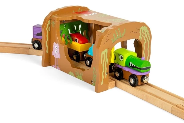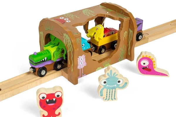 Het is griezelen geblazen in deze monster tunnel! Rijd u er met een trein doorheen, dan zult u langs een hangend geel monster moeten en groen slijm van vilt. Een geweldige accessoire die de fantasie van kinderen stimuleert. De tunnel heeft een afmeting van 16,5x12,5x11 cm en is voorzien van een rail. Hierdoor is de tunnel eenvoudig te integreren in een treinset. Gemaakt van FSC®-gecertificeerd hout en compatible met andere merken.