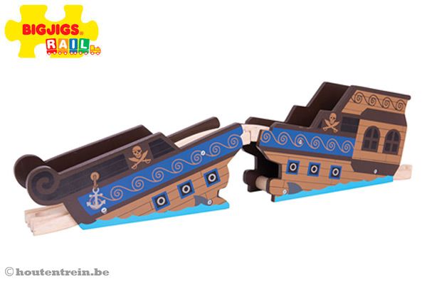 Piraten treinset van Bigjigs. Deze 42 delige set is geschikt voor stoere kids vanaf 3 jaar. De set wordt geleverd met 4 piraten, een locomotief met 2 wagonnen, boot, 2 haaien en 2 octopussen. De trein moet over een gevaarlijk spoor door golven en langs piraten, haaien en octopussen.