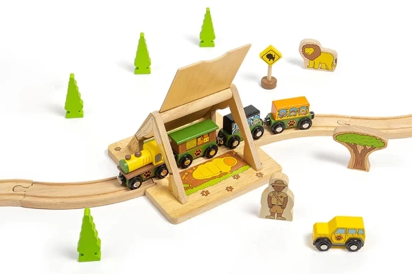 Spot wilde dieren tijdens het grote Safari-avontuur. Dat kan met deze Safari-set van Bigjigs. Een aap, giraf, olifant of een leeuw of rijdt onder de watervalbrug door, u komt het tijdens de safari allemaal tegen. Met maar liefst 38 onderdelen geniet uw kind van uren speelplezier. De treinset is gemaakt van duurzaam gekweekt hout en is geschikt voor kinderen vanaf 3 jaar.