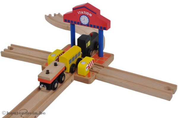 Statin met spoorbomen van Woodtoys. Sluit uw treinbaan van alle kanten op dit station aan en u kunt dit station tevens als kruising gebruiken. De spoorbomen kunnen omhoog en omlaag en zijn 360 graden draaibaar.